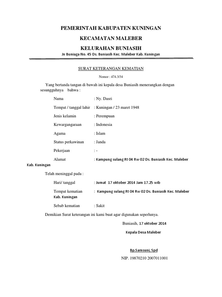 Contoh Surat Kematian Dari Desa / Surat Kematian : Contoh surat keterangan janda duda dari desa surat k… contoh surat keterangan sudah meninggal dunia atau kematian dari keuchik desa.. Jenis surat keterangan kematian ini merupakan jenis surat dengan kode: Surat keterangan usaha ini berguna sebagai payung. Siapkan juga fotocopy surat nikah orang tua di legalisir oleh kua setempat (jika yang mengurus anak) Surat keterangan ahli waris ini sebenarnya sangatlah penting untuk membuktikan bahwa seseorang memang benar ahli waris yang sah dari pewaris. Itulah contoh surat pengantar dari rt/rw dan kelurahan/desa.